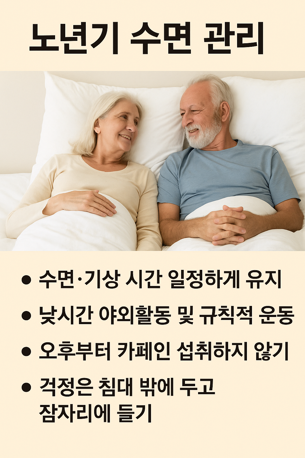 요약: 노년기에는 깊은 수면 비율 감소·이른 기상·밤중 각성이 흔합니다. 그러나 생활 리듬·수면 환경·섭취 관리만 잘해도 수면의 질을 충분히 회복할 수 있습니다.