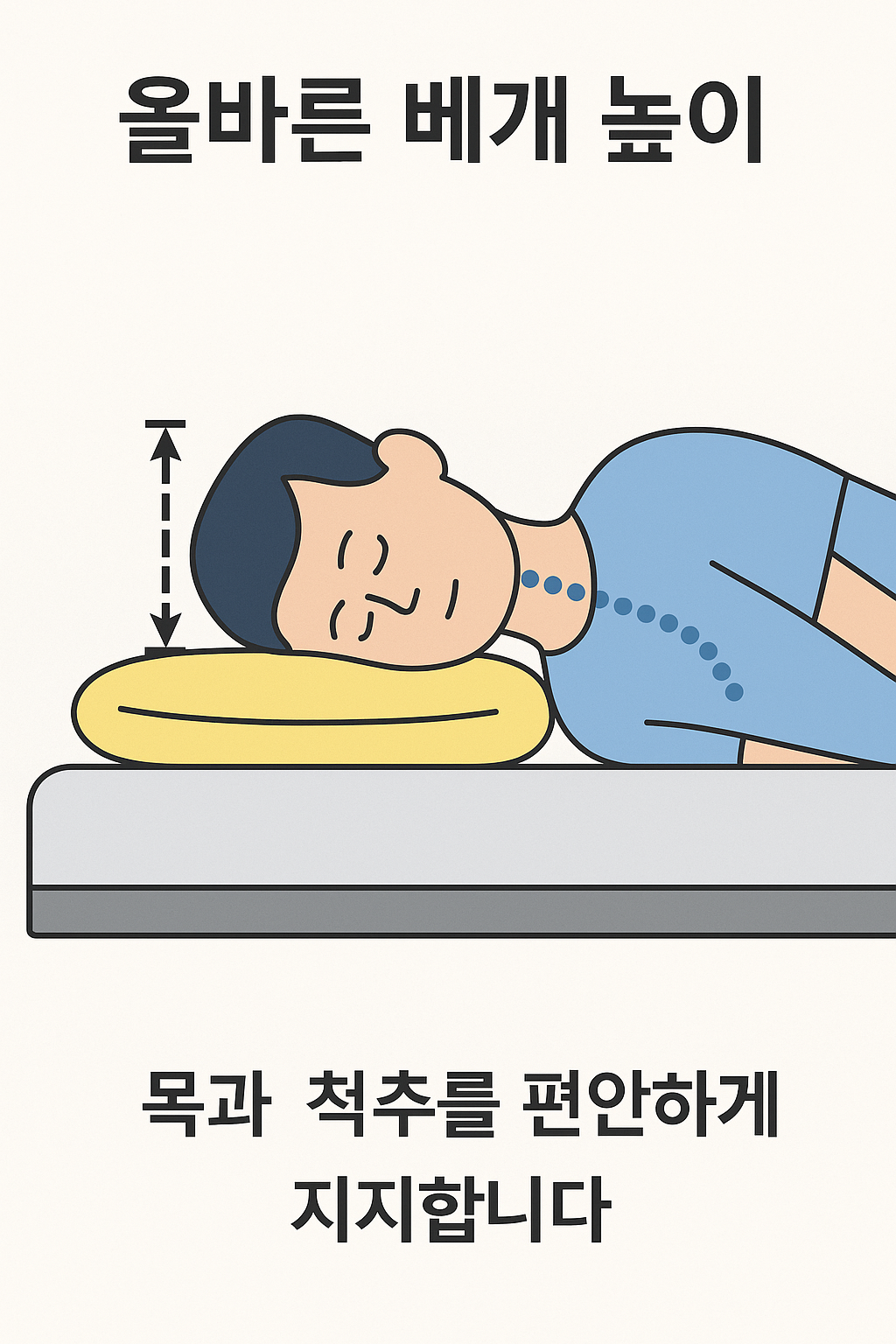 - 옆으로 잘 때는 어깨 두께를 고려해 조금 높은 베개