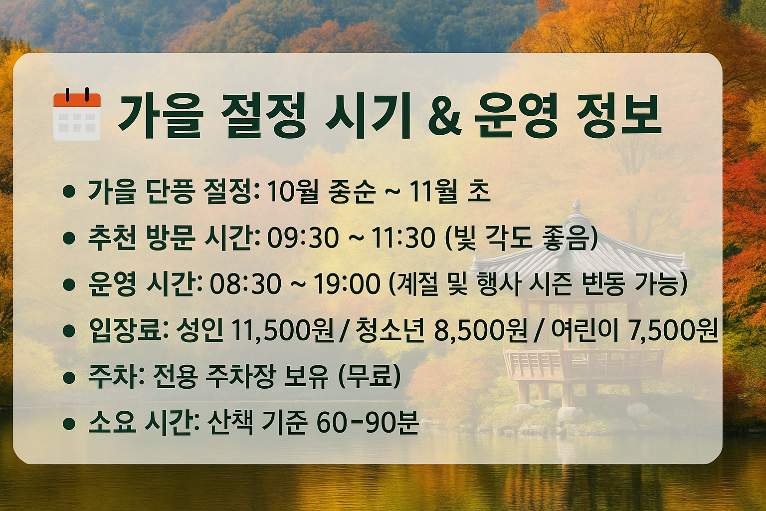 - 단풍 절정: 10월 중순 ~ 11월 초