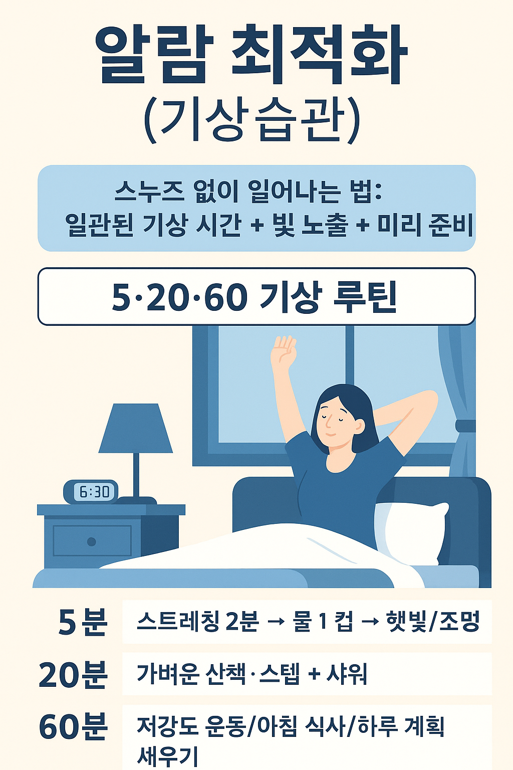 요약: 좋은 기상은 전날 밤부터 시작됩니다. 기상 시간 고정, 스누즈 차단, 빛·물·움직임 루틴으로 아침 관성을 줄이고 하루 생산성을 끌어올리세요.