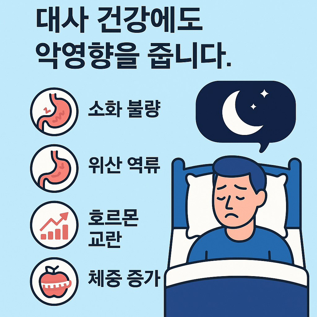 - 호르몬 교란: 인슐린·코르티솔 분비로 생체리듬 혼란