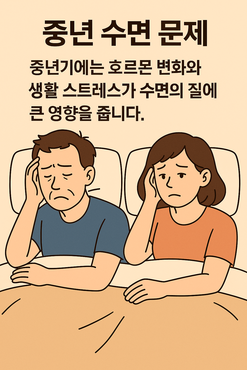 요약: 중년에는 갱년기 호르몬 변화, 스트레스, 건강 문제로 인해 불면·밤중 각성·이른 기상이 흔히 발생합니다. 이를 관리하지 않으면 만성 피로와 우울증으로 이어질 수 있습니다.